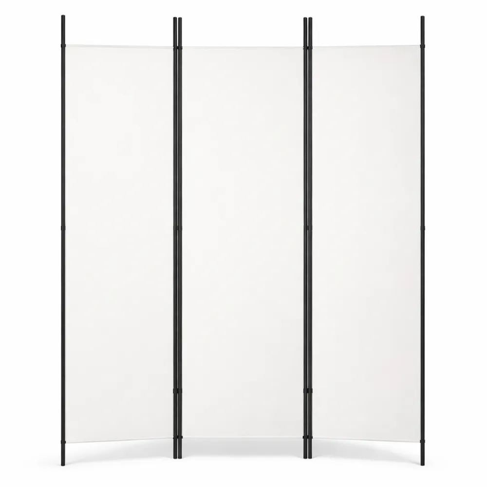 3 pannelli: Questo paravento è composto da 3 pannelli in tessuto per creare uno spazio privato e riparato dalla vista. Si può utilizzare come separé nelle stanze della casa. Protezione della privacy: Il frangivista aiuta a proteggere la privacy in spazi interni ed esterni, creando una zona riservata. Pannelli con perni: I pannelli del paravento pieghevole sono collegati con perni in plastica per regolarli facilmente. Possono essere rimossi per riporli quando non servono. Struttura in metallo: Il divisorio ha una struttura in metallo con 6 piedini di supporto per maggiore stabilità. Dimensioni: Dimensioni generali: 253L x 50P x 182A cm (aperto). Dimensione di ogni pannello: 84L x 50P x 182A cm.